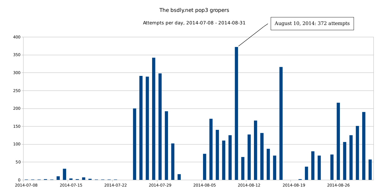 Update 2014-08-21: I spoke too soon about the pop3 password gropers giving up and moving on. In fact, only a few hours after the last update (in the early morning CEST hours of August 20th), two more attempts occured: