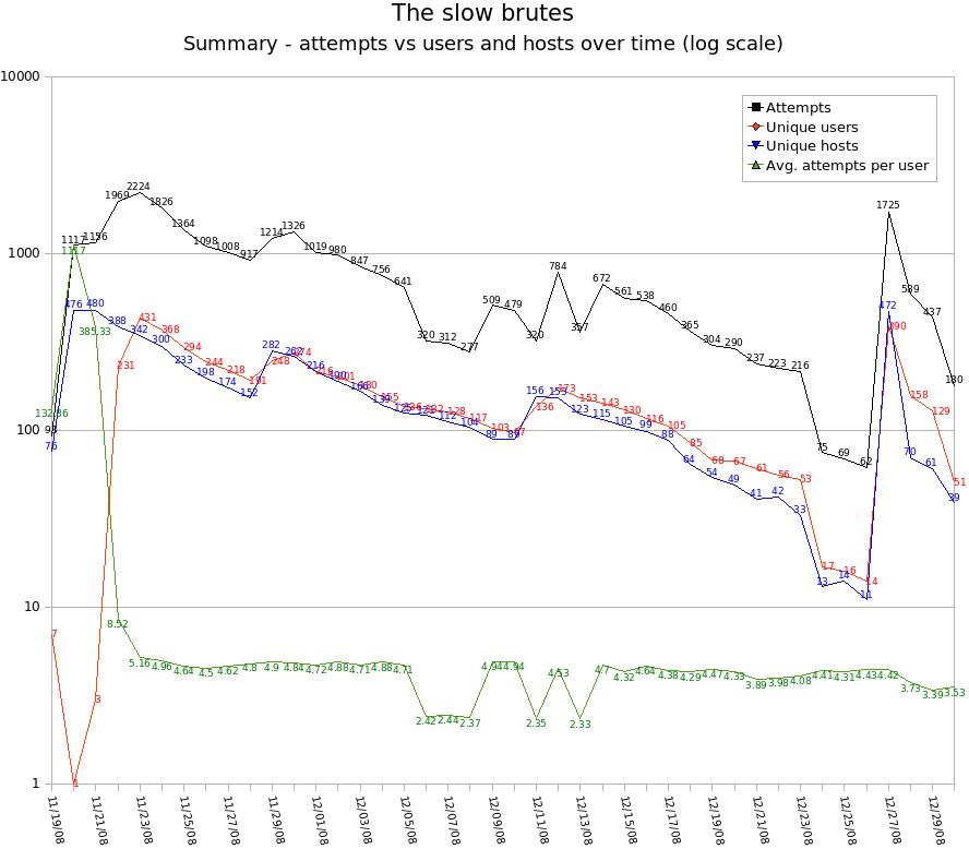The full collection of raw data is available here, with a .csv summarising number of attempts, user names and hosts per day here.